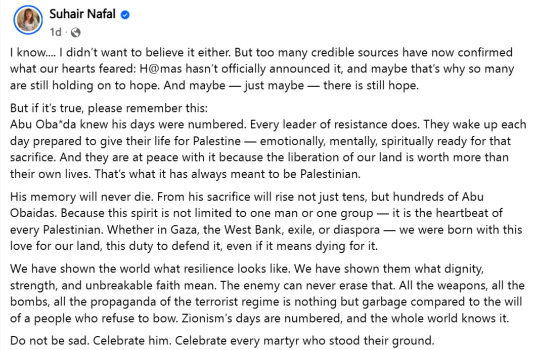 The post, which praised the Hamas official as a "martyr" and celebrated his sacrifice for the violent cause of Hamas, represents the latest in a pattern of extremist rhetoric from Barakat, who has consistently used her platform to glorify violence against Israeli civilians and promote terrorist organizations.