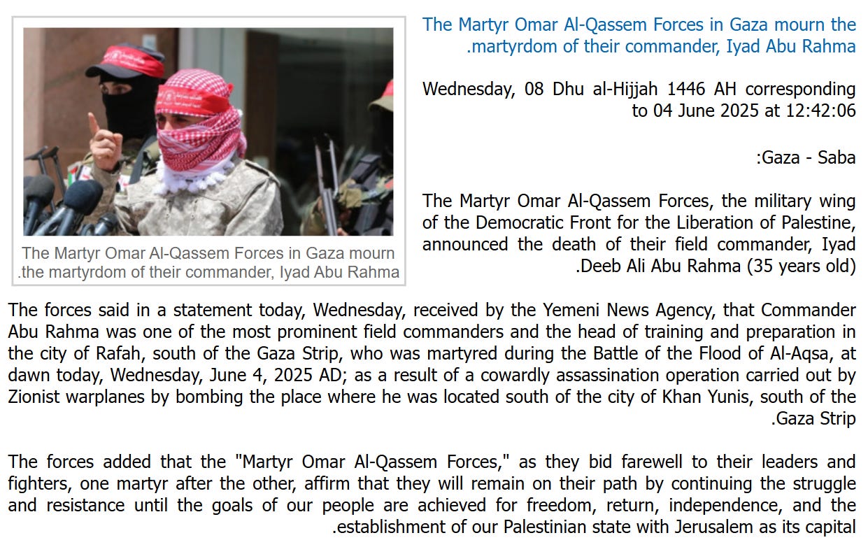 In June, Al-Haq issued a statement mourning the death of Eyad Abu Rahma, who was reportedly killed in an Israeli airstrike in Gaza. Eyad, the brother of Al-Haq field researcher Mohammad Abu Rahma, was posthumously honored as a "martyr" by the organization. However, Jewish Onliner previously revealed that Eyad was actually a senior Democratic Front for the Liberation of Palestine (DFLP) terrorist leader, not a civilian as the organization claimed.