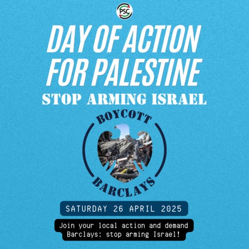 On April 26, Palestine Solidarity Campaign (PSC) is hosting a “Day of Action for Palestine” at various locations in the U.K. to boycott Barclays and demand they cut ties with Israel.