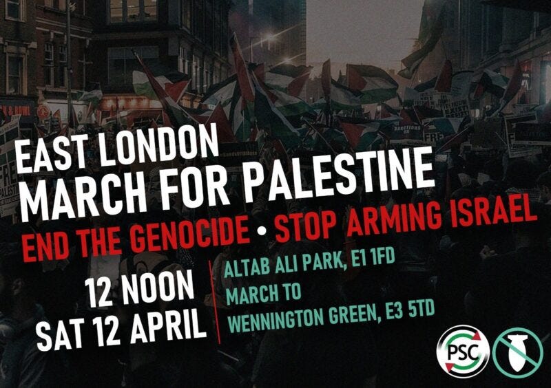 On April 12, at 12 PM, the Palestine Solidarity Campaign (PSC) will host a march in East London from Altab Ali Park to Wennington Green. The group is calling to “end the genocide” and “stop arming Israel.”