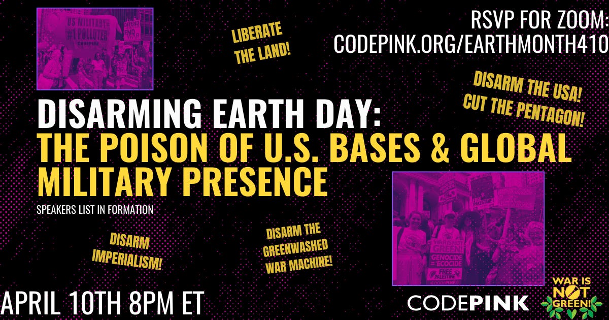CODE PINK is hosting a virtual event with the pro-North Korea organization Nodutdol on “The Poison of US Bases and Global Military Presence” on April 10 at 8 PM.
