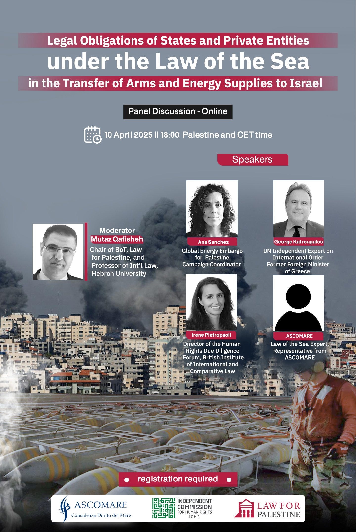 On April 10, at 7 PM, Law for Palestine, in collaboration with ASCOMARE and The Independent Commission For Human Rights, will host a webinar discussing the legal obligations of states in regard to weapons and energy shipments to Israel. The event description accuses Israel of committing “genocide.”