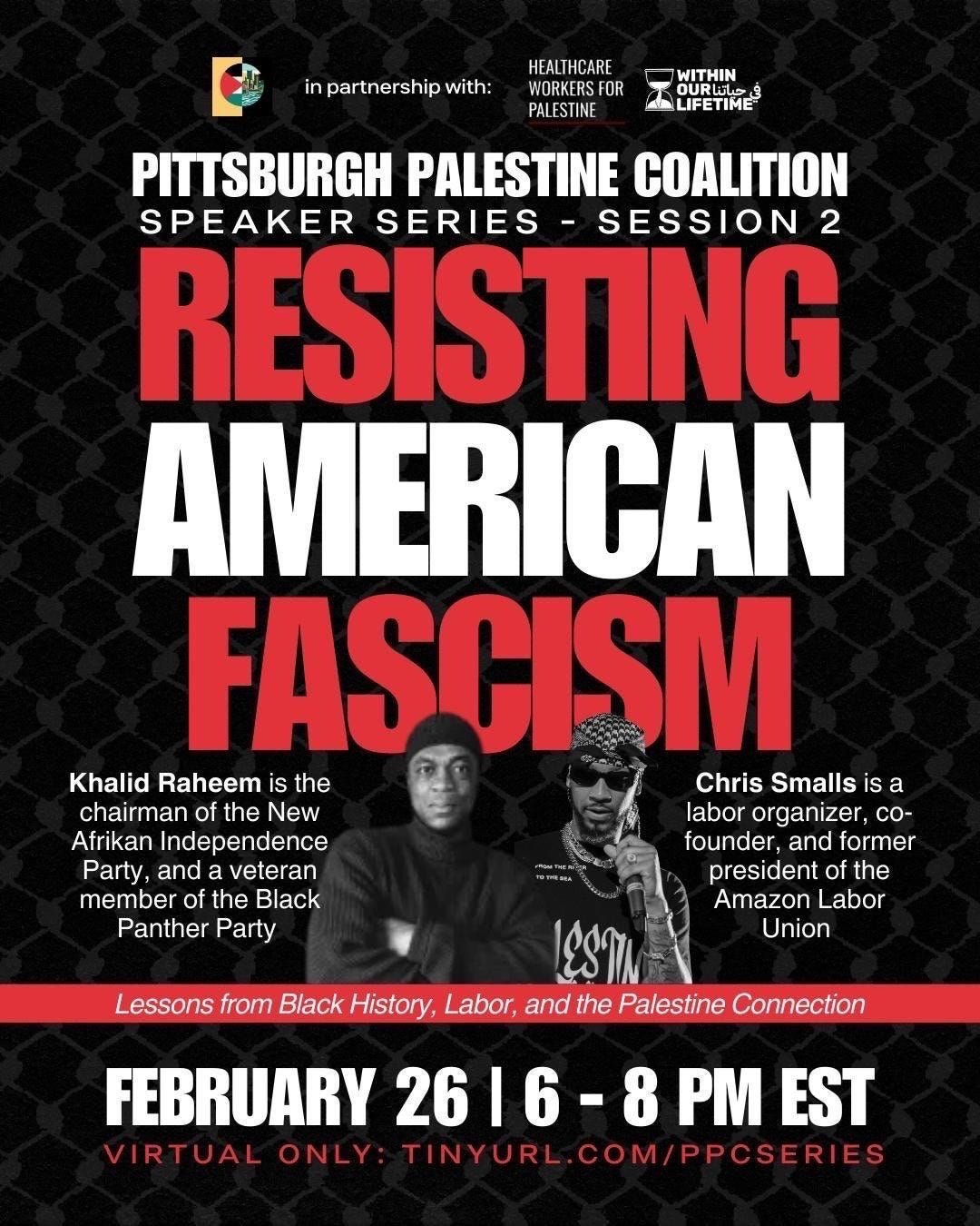 The Pittsburgh Palestine Coalition, Within Our Lifetime, and Healthcare Workers for Palestine are joining forces to host a webinar titled “Resisting American Fascism.”
