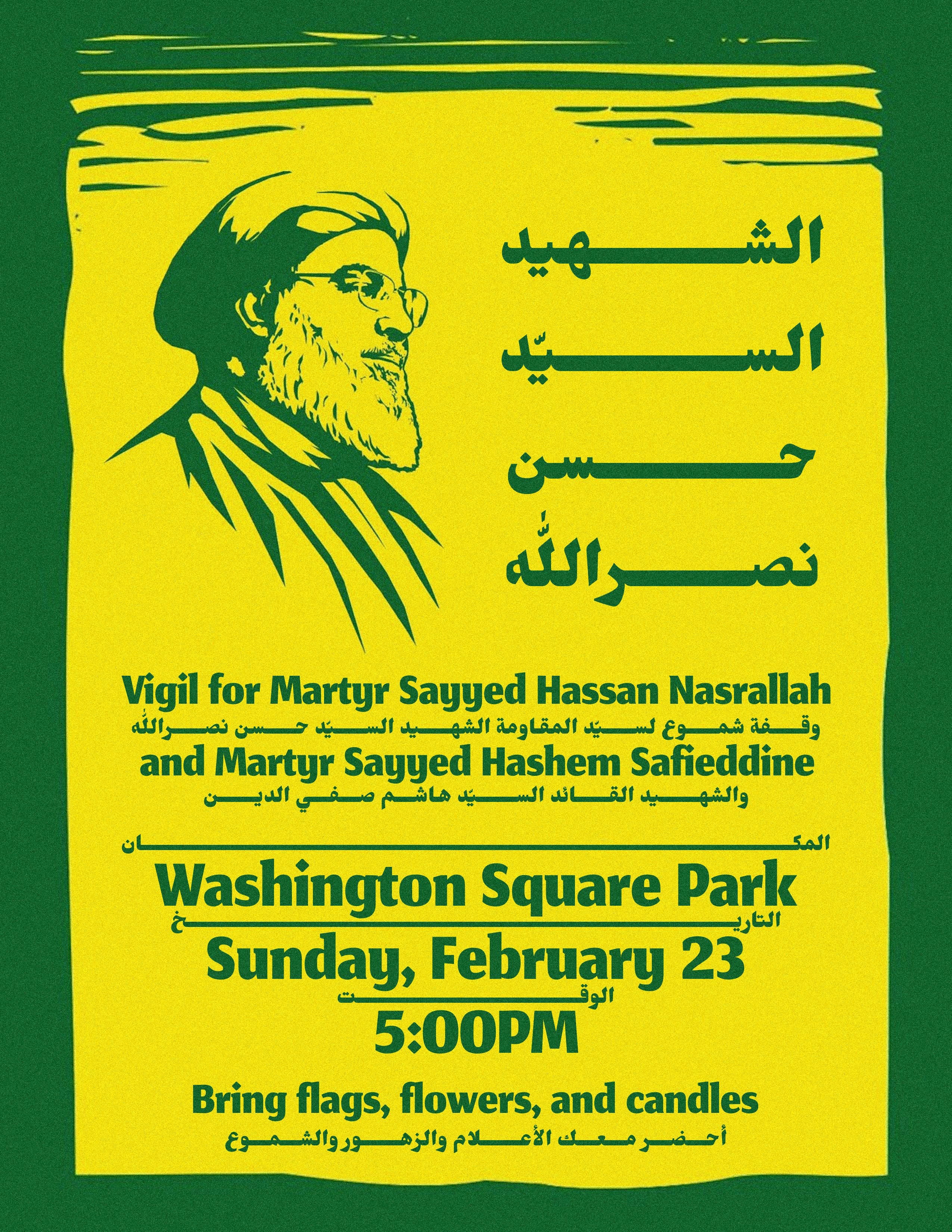 The Bronx Anti-War Coalition will hold a “Vigil for Martyr Sayyed Hassan Nasrallah” today at Washington Square Park, coinciding with the funeral of the Hezbollah leader in Lebanon. The event openly glorifies Nasrallah, head of the U.S.-designated terrorist organization responsible for decades of violence against Israel and civilians worldwide.