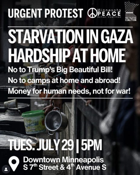 Minnesota-area anti-Israel groups are holding a protest titled “Starvation in Gaza, hardship at home” on July 29 outside the offices of Sen. Amy Klobuchar.