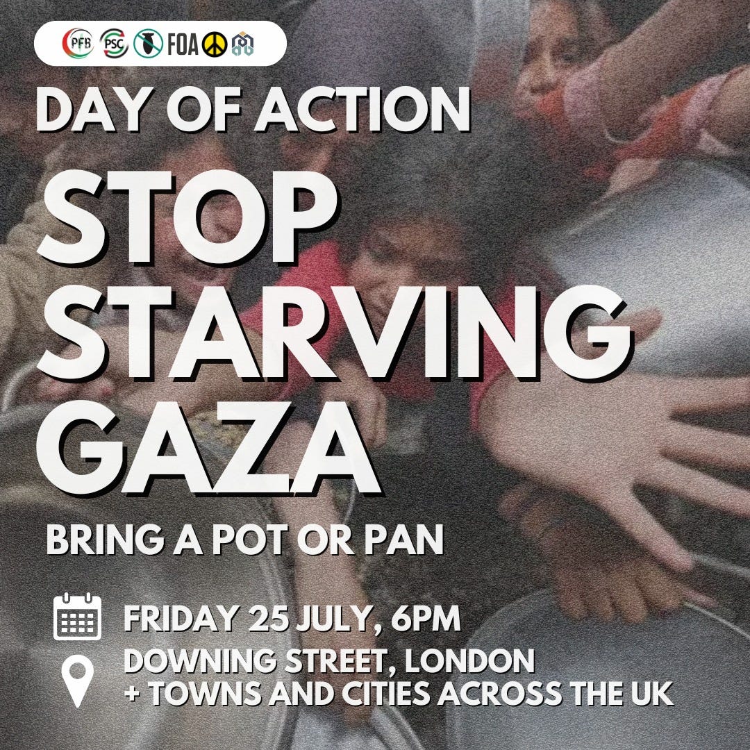 UK pro-Palestinian organizations will hold 6pm protest on July 25th in Downing Street, London. They call participants to bring "pots and pans" to highlight the "Gaza starvation," as part of the Day of Action. Similar events are expected to take place tomorrow across the UK and the US.