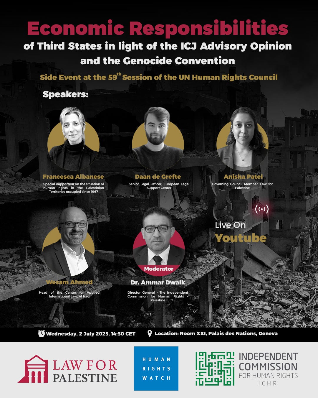 Law for Palestine, Human Rights Watch and ICHR are holding an in-person event (which will be livestreamed on YouTube) from the 59th session of the UN Human Rights Council on July 2. UN Special Rapporteur Francesca Albanese and other speakers will discuss the economic responsibilities of third states considering the ICJ Advisory Opinion and the Genocide Convention.