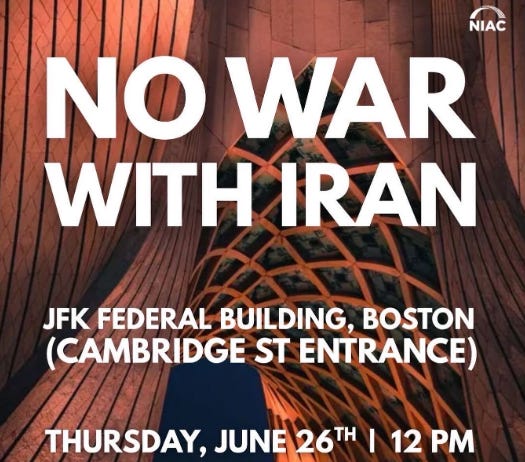 Boston-area organizations will hold a "No War with Iran" rally on June 25, in front of Boston’s JFK Federal Building at noon.