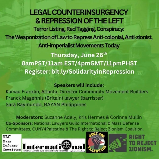 CUNY for Palestine, National Lawyers Guild International, and others are holding a webinar on June 26, on "Legal Counterinsurgency and Repression of the Left" featuring a speaker from Palestine Action UK, which was banned in the UK earlier this week.