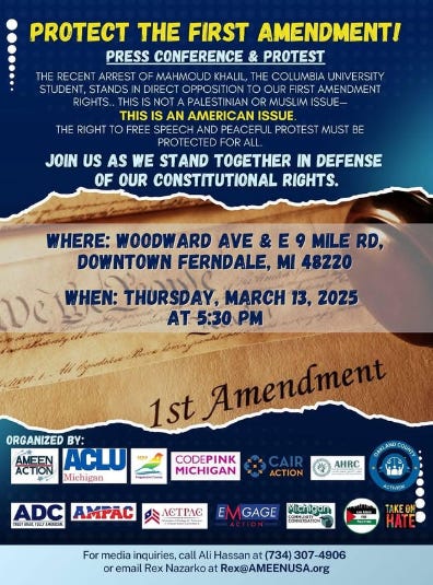 A coalition of national Muslim and anti-Israel organizations, including CAIR, CODEPINK, EMGAGE Action, and the American Civil Units (ACLU), will hold a press conference and a protest today in a suburb of Detroit under the banner “Protect the First Amendment.”