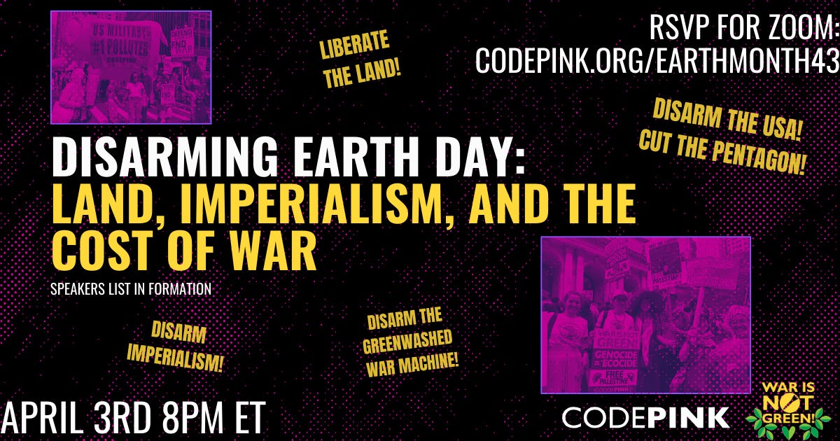 CODEPINK is hosting a Zoom webinar headlined “Disarming Earth Day: Land, Imperialism, and the Cost of War” on April 3. The flyer features a call to “disarm the USA.”