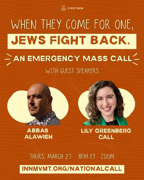 IfNotNow is hosting an “emergency mass call” today headlined “Jews Fight Back,” featuring Uncommitted Movement cofounder Abbas Alawieh and former Biden staffer Lily Greenberg.