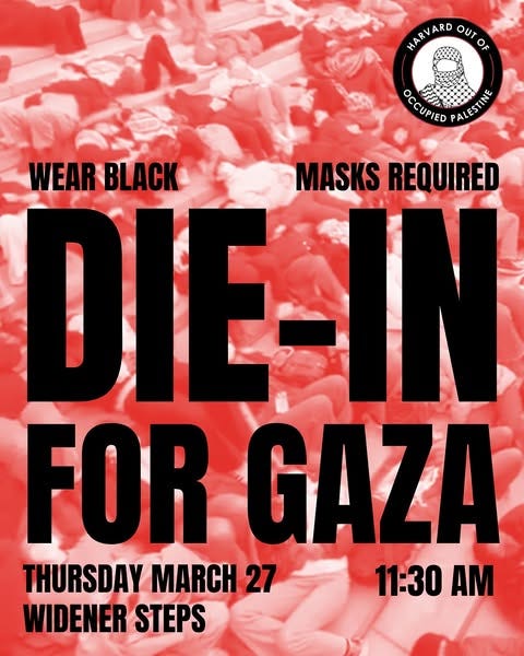 Harvard University pro-Palestinian groups are organizing a “die-in for Gaza” protest on March 27 at 11:30AM.