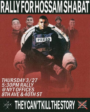 PYM, WAWOG and other anti-Israel groups are organizing a rally in front of The New York Times HQ in NYC on March 27 at 5:30PM for Hossam Shabat, a Hamas member and journalist killed in Gaza earlier this week.