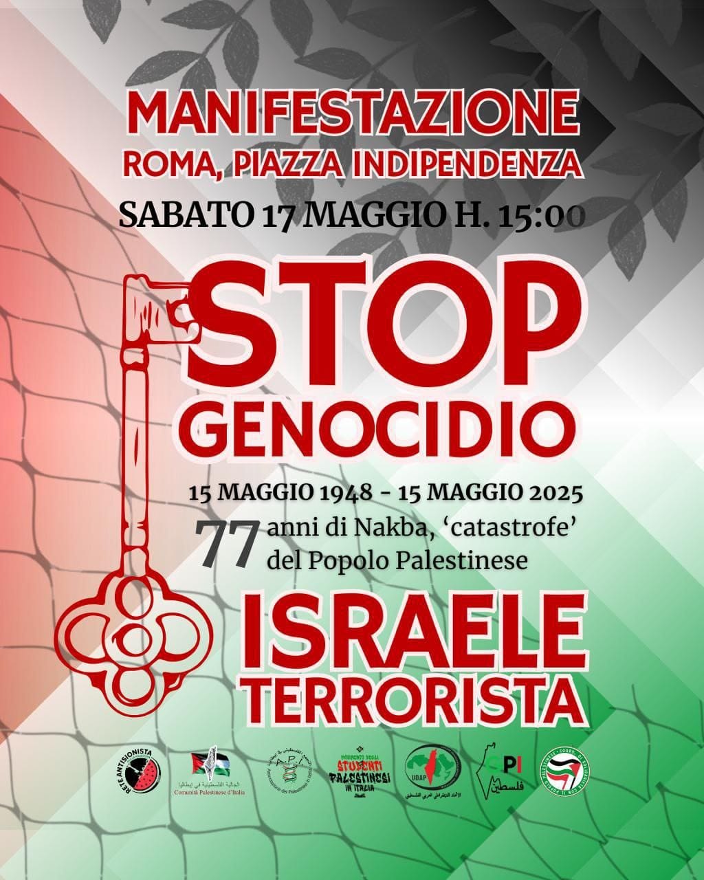“Nakba Day”: Assopace Palestina and others will be marking “Nakba Day” on May 17 at the Piazza Indpendeza in Rome.