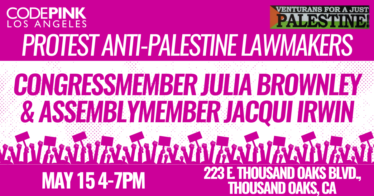 On May 15 from 4-7pm, CODEPINK will host a protest against the congress member Julia Brownley and the assembly member Jaqui Irwin, over claims that they are “anti-Palestine.” The protest will be held in front of the building where Brownley and Irwin have offices.