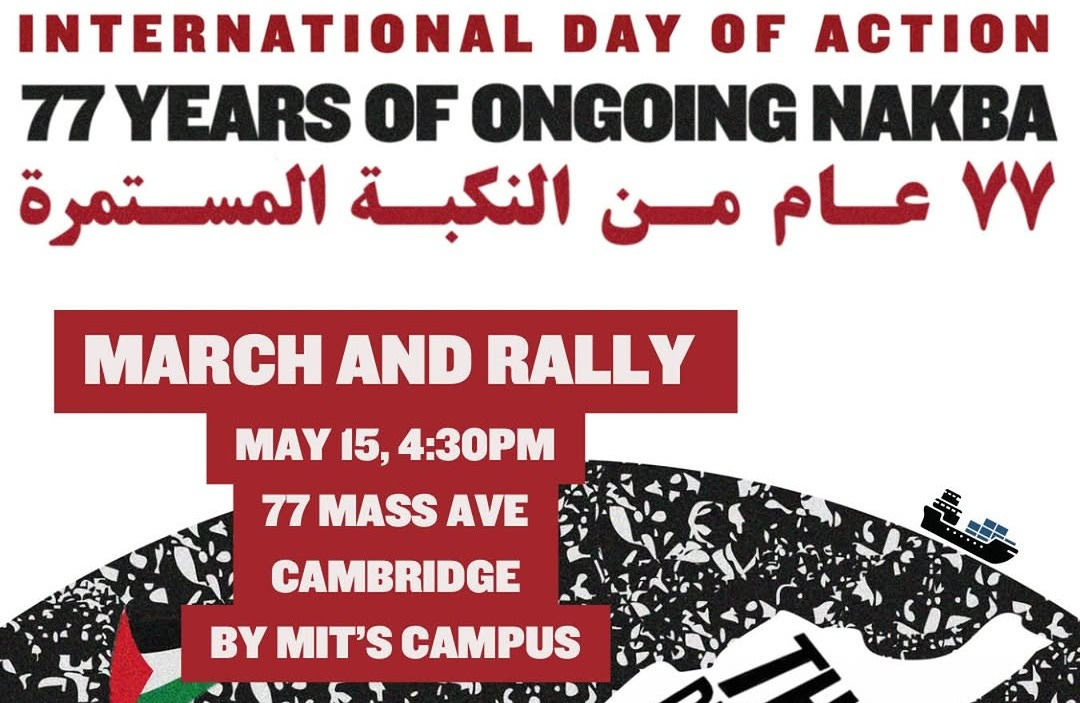 On May 15 at 4:30pm, Boston Coalition for Palestine will host a march and rally for Nakba Day in front of MIT’s lobby.