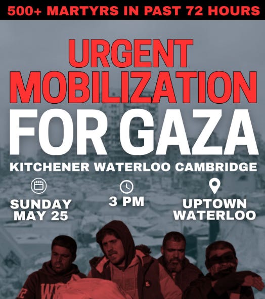 On May 25, at 3pm, Palestinian Youth Movement (PYM) Toronto will host an urgent mobilization for Gaza in uptown Waterloo, Ontario.