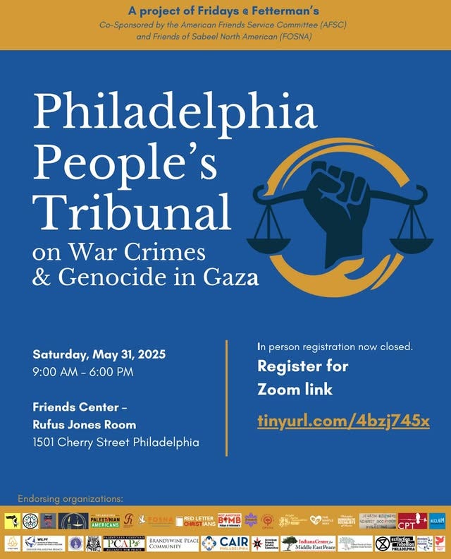 Numerous organizations will hold a "Philadelphia People's Tribunal on War Crimes & Genocide in Gaza" on May 31 at the Friends Center.