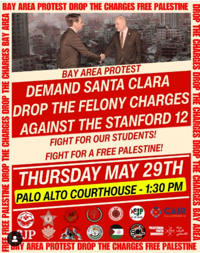 Stanford SJP will rally at the Palo Alto Courthouse on May 29 for the arraignment of 12 Stanford students arrested last year in connection with campus protests.