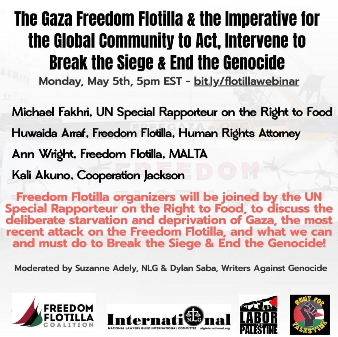 The Freedom Flotilla Coalition, NLG, and CUNY4Palestine will hold the webinar “The Gaza Freedom Flotilla and the Imperative for the Global Community to Act” on May 5 at 5 PM. Speakers include UN Special Rapp. on Food Michael Fakhri; Freedom Flotilla member Huwaida Arraf; and current Freedom Flotilla passenger Ann Wright. This webinar follows an alleged drone attack on the flotilla near Malta last Friday.