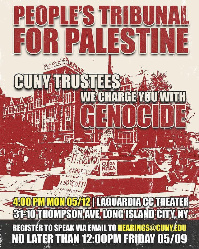 CUNY pro-Palestinian student groups plan to turn CUNY’s Board of Trustees public hearing on May 12 into a “People’s Tribunal for Palestine” to charge them with “genocide.”