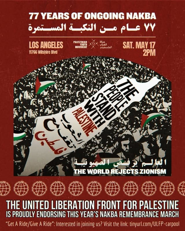 The United Liberation Front endorsed PYM’s “Nakba 77 Remembrance March” at the Israeli consulate in Los Angeles on Saturday, May 17 at 2 PM.