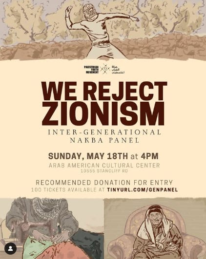 Palestinian Youth Movement (PYM) will hold an “Intergenerational Nakba Panel” titled “We Reject Zionism” on May 18 at 4 PM at Houston’s Arab American Cultural Center.