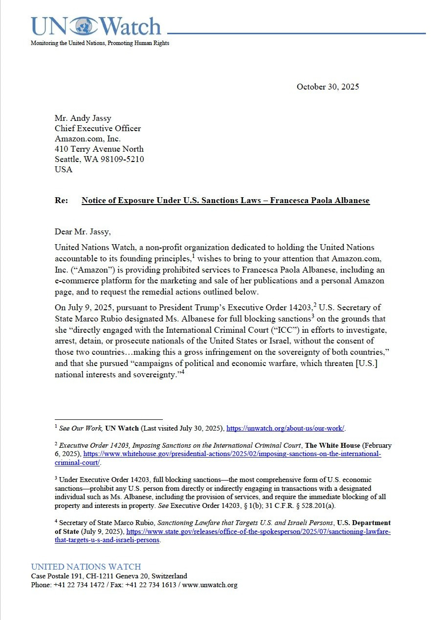 UN Watch, the Swiss-based organization that monitors the United Nations, sent Amazon a formal legal demand letter on October 30, 2025. Executive director Hillel Neuer reminded Amazon CEO Andy Jassy that the company faces significant exposure if it continues providing a platform for Albanese.
