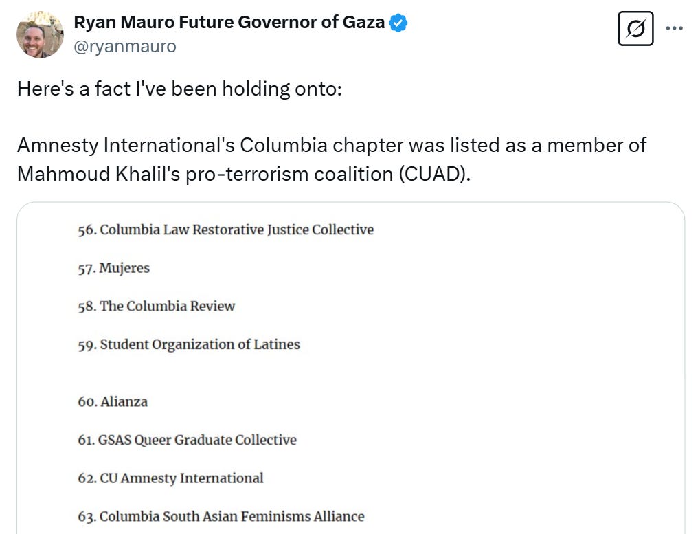 On March 16, Ryan Mauro, an investigative researcher with the Capital Research Center, highlighted how Amnesty International’s Columbia chapter is listed as a member of Columbia University Apartheid Divest (CUAD), an anti-Israel student coalition led by Mahmoud Khalil, who was recently arrested by Federal Immigration Authorities for inciting what have been characterized as pro-Hamas campus protests.