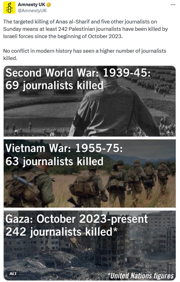 Amnesty UK commemorates Anas Al-Sharif, confirmed by the IDF as a Hamas terrorist, and claims the Israel-Hamas war is the deadliest conflict for journalists, minimizing the higher toll during WWII