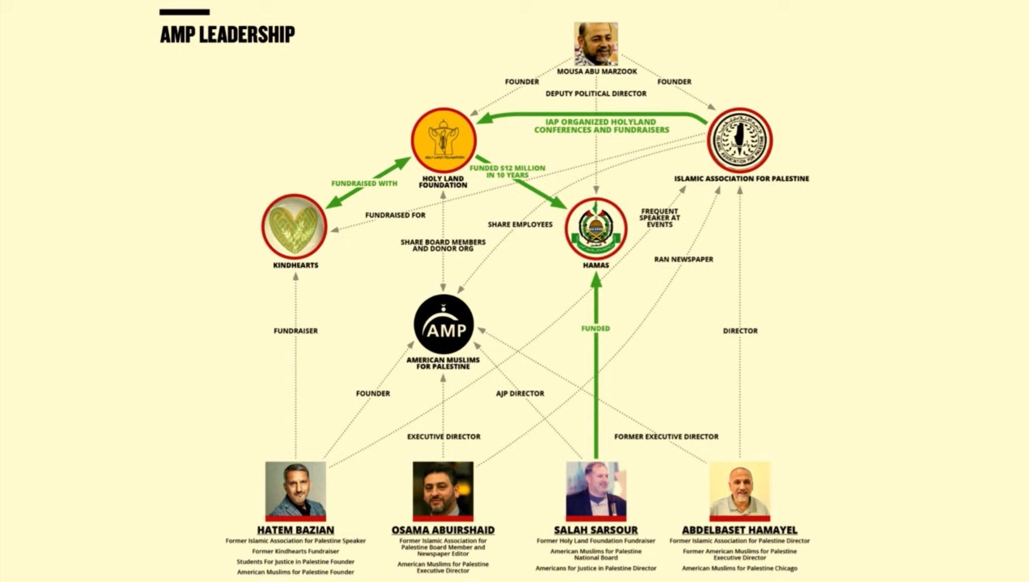 A 2017 lawsuit by victims of a 1996 Hamas attack alleges that AMP operates as an offshoot of the Islamic Association for Palestine and the Holy Land Foundation, both convicted of funneling millions to Hamas. Research by George Washington University’s Program on Extremism supports this claim, showing that AMP was created as a successor organization to the IAP, which was founded with startup money from Hamas leader Mousa Abu Marzook.