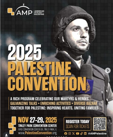 Adding to the controversy, AMP has promoted conference events including, “A rich program celebrating our martyrs & heroes” on social media, featuring an image of Anas Al-Sharif. The IDF confirmed that Al-Sharif was “head of a Hamas cell, responsible for facilitating and advancing rocket attacks against Israeli civilians and IDF forces” while simultaneously working as an Al Jazeera journalist. Al-Sharif was eliminated in an Israeli airstrike in Gaza City in August 2025, with AMP’s promotional materials appearing to celebrate him as a heroic figure despite his terror activities.