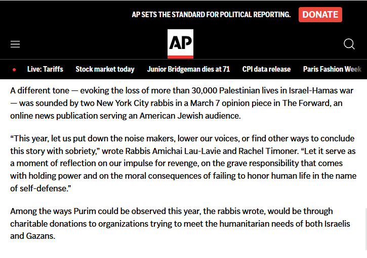 Similarly, The Forward has contributed to these distortions. A widely quoted Forward article, even cited by the Associated Press, attempts to frame Purim in the context of Israel’s conflict with Hamas in a way that misrepresents Jewish self-defense as an act of genocide. This follows a familiar pattern of equating Jewish survival with aggression, reinforcing harmful narratives that have been weaponized against Jews throughout history.
