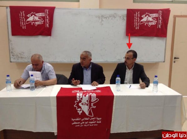 Awad Abdelfattah, former secretary general of the Democratic National Party in Israel, met with PFLP leaders in Jenin in 2014 to discuss coordinating “resistance” efforts, a euphemism for terrorism.