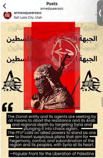 According to Wirthlin’s findings, the group Armed Queers SLC promoted terrorist propaganda through materials like a zine that quotes Leila Khaled, stating “No liberation is achieved without resistance.” Khaled is a member of the U.S.-designated terror group the Popular Front for the Liberation of Palestine (PFLP), who hijacked two civilian passenger planes.