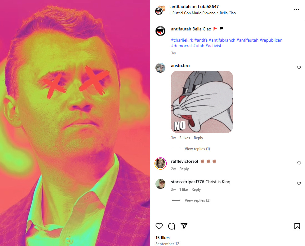The report documents disturbing celebrations of Charlie Kirk’s murder by accounts affiliated with these radical leftist networks. Following Charlie Kirk’s murder, several Utah-based radical leftist social media accounts posted a video showing Charlie Kirk, President Donald Trump, Vice President J.D. Vance, Senator Mike Lee, and Israeli Prime Minister Benjamin Netanyahu with their eyes crossed out. The video was accompanied by “Bella Ciao,” an antifascist song whose title was engraved on a bullet casing found in the rifle used to kill Kirk.