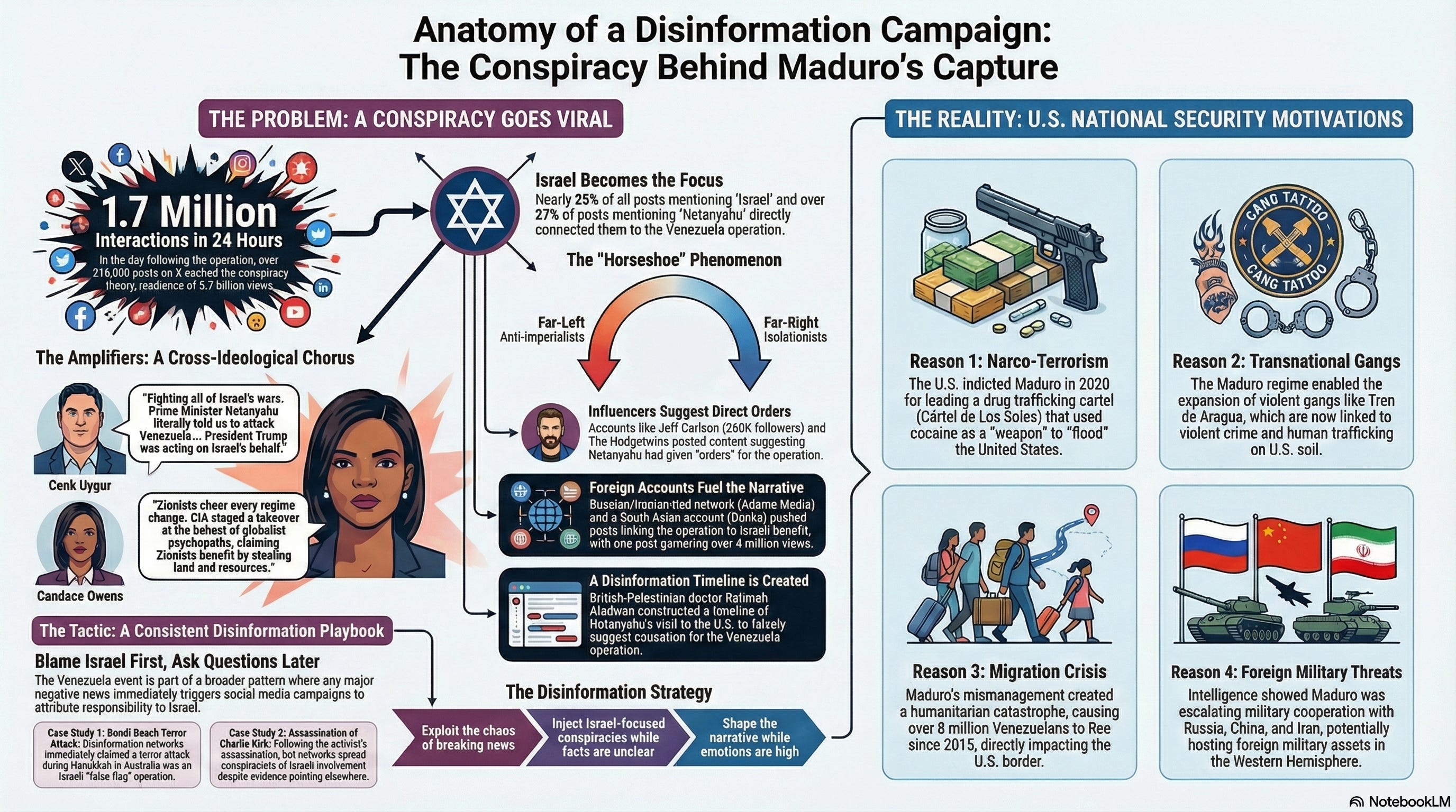 Anti-Israel influencers and foreign disinformation accounts push coordinated narratives linking Venezuelan intervention to Israel, ignoring the ongoing threat Maduro posed to Americans