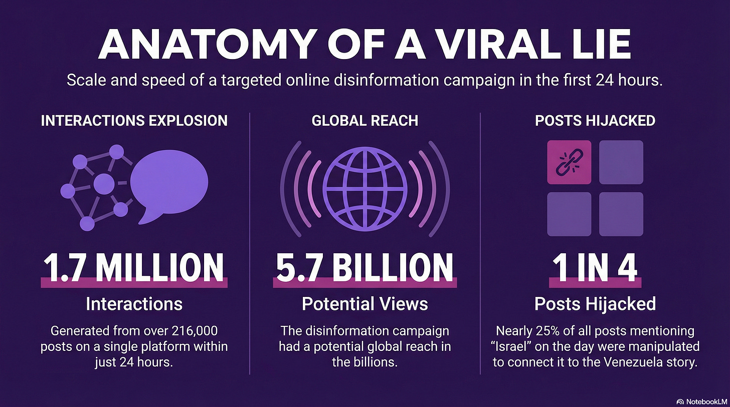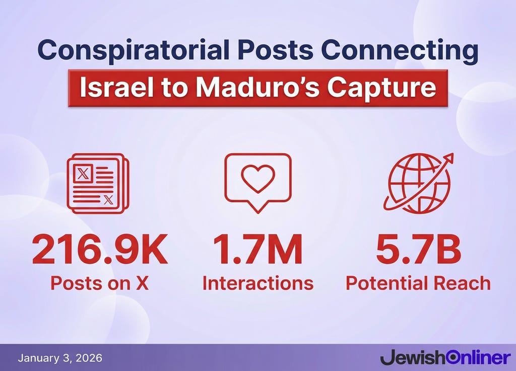 In the 24 hours following the U.S. military operation that captured Venezuelan President Nicolás Maduro, a wave of conspiracy theories swept across social media connecting the intervention to Israel. Far-right commentators and accounts based outside the United states generated over 216,000 posts on X alone promoting this narrative, accumulating 1.7 million interactions and reaching a potential view count of 5.7 billion views.