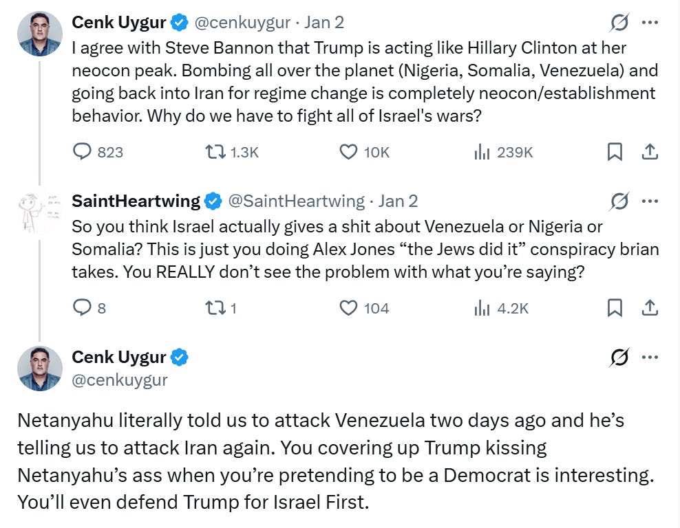 Cenk Uygur, host of The Young Turks, seized on Israeli Prime Minister Benjamin Netanyahu’s recent comments about Venezuela-Iran ties to construct his theory. “Netanyahu literally told us to attack Venezuela two days ago and he’s telling us to attack Iran again,” Uygur posted. One day prior, he argued that Trump was “fighting all of Israel’s wars.” He framed the operation as Netanyahu’s doing rather than Trump’s independent decision, ostensibly arguing that Israel was behind major American foreign policy decisions.