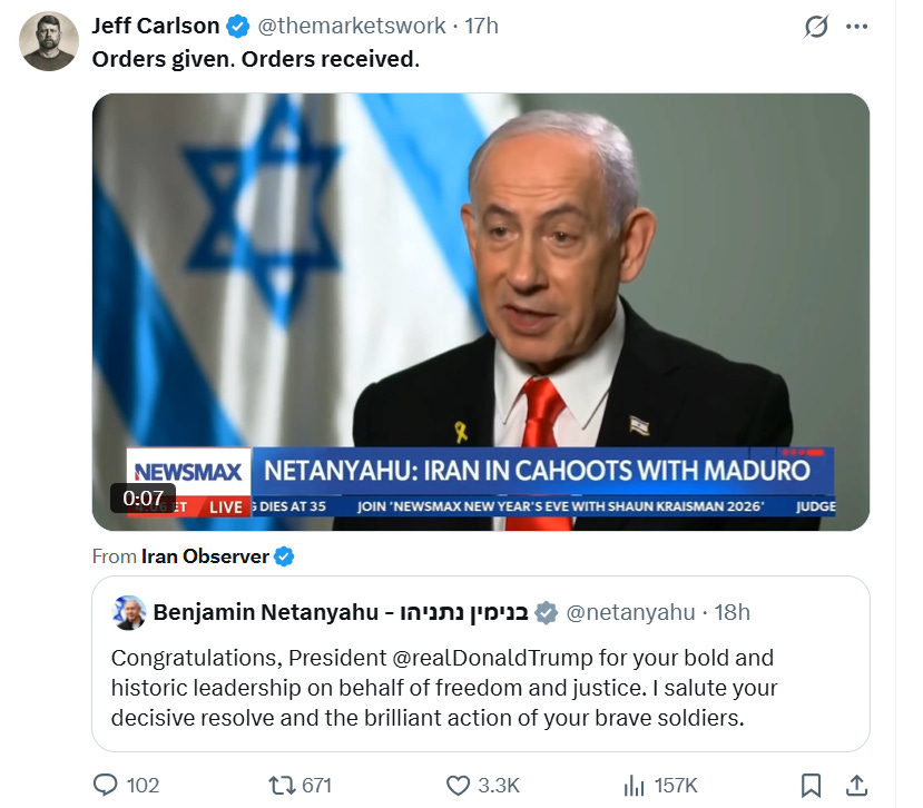 Jeff Carlson, an account with 260K followers and claims to be a Chartered Financial Analyst, shared a video of Netanyahu with the caption “Orders given. Orders received,” directly suggesting that the Israeli Prime Minister had commanded Trump to execute the Venezuela operation.