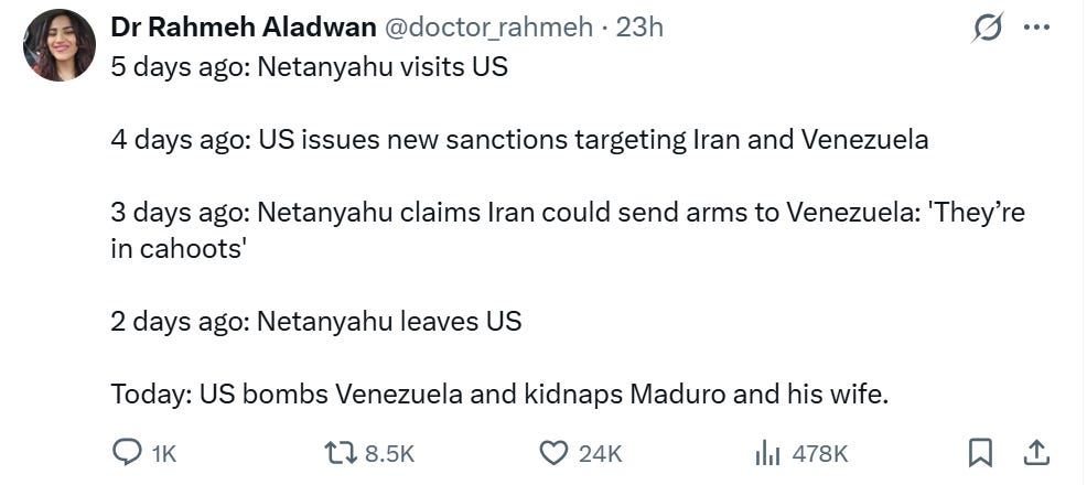 British-Palestinian doctor Rahmeh Aladwan, who was suspended from practicing medicine by a medical tribunal for publishing antisemitic posts and praising Palestinian terrorism, constructed a timeline designed to suggest causation: “5 days ago: Netanyahu visits US. 4 days ago: US issues new sanctions targeting Iran and Venezuela. 3 days ago: Netanyahu claims Iran could send arms to Venezuela: ‘They’re in cahoots’. 2 days ago: Netanyahu leaves US. Today: US bombs Venezuela and kidnaps Maduro and his wife.”