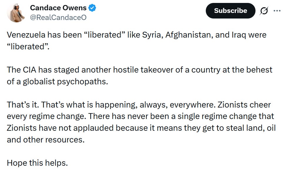 Candace Owens issued a lengthy statement arguing that “The CIA has staged another hostile takeover of a country at the behest of a globalist psychopaths.” She continued: “That’s it. That’s what is happening, always, everywhere. Zionists cheer every regime change. There has never been a single regime change that Zionists have not applauded because it means they get to steal land, oil and other resources.”