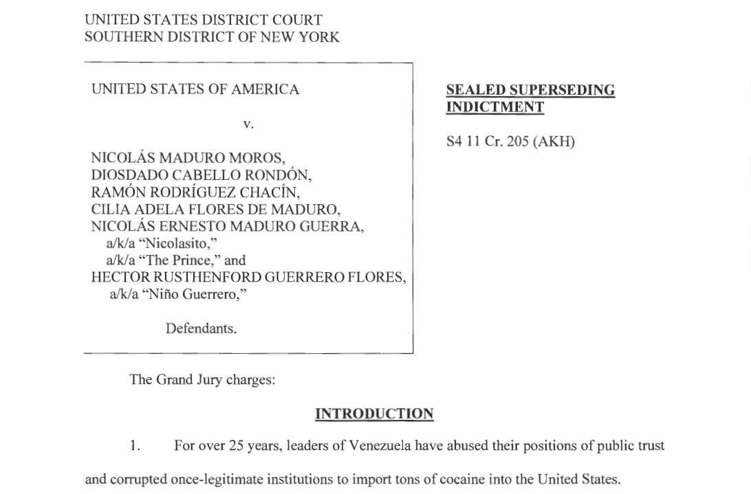The United States indicted Maduro in March 2020 on charges of narco-terrorism, drug trafficking conspiracy, and firearms offenses. According to the indictment issued by the U.S. Attorney’s Office for the Southern District of New York, Maduro and members of his regime conspired with the Revolutionary Armed Forces of Colombia (FARC) to “flood” the United States with cocaine, explicitly viewing drug trafficking as a weapon against America. The Justice Department alleged that Maduro helped manage and ultimately led the Cártel de Los Soles (Cartel of the Suns), a drug trafficking organization composed of high-ranking Venezuelan officials who used cocaine as a tool of geopolitical warfare.
