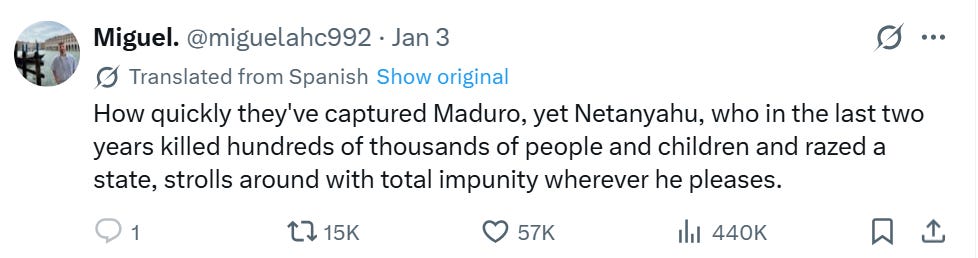 Notably, @miguelahc992, an account with only 2,500 followers, managed to amass 57,000 likes with a post stating: “How quickly they’ve captured Maduro, yet Netanyahu, who in the last two years killed hundreds of thousands of people and children and razed a state, strolls around with total impunity wherever he pleases.”