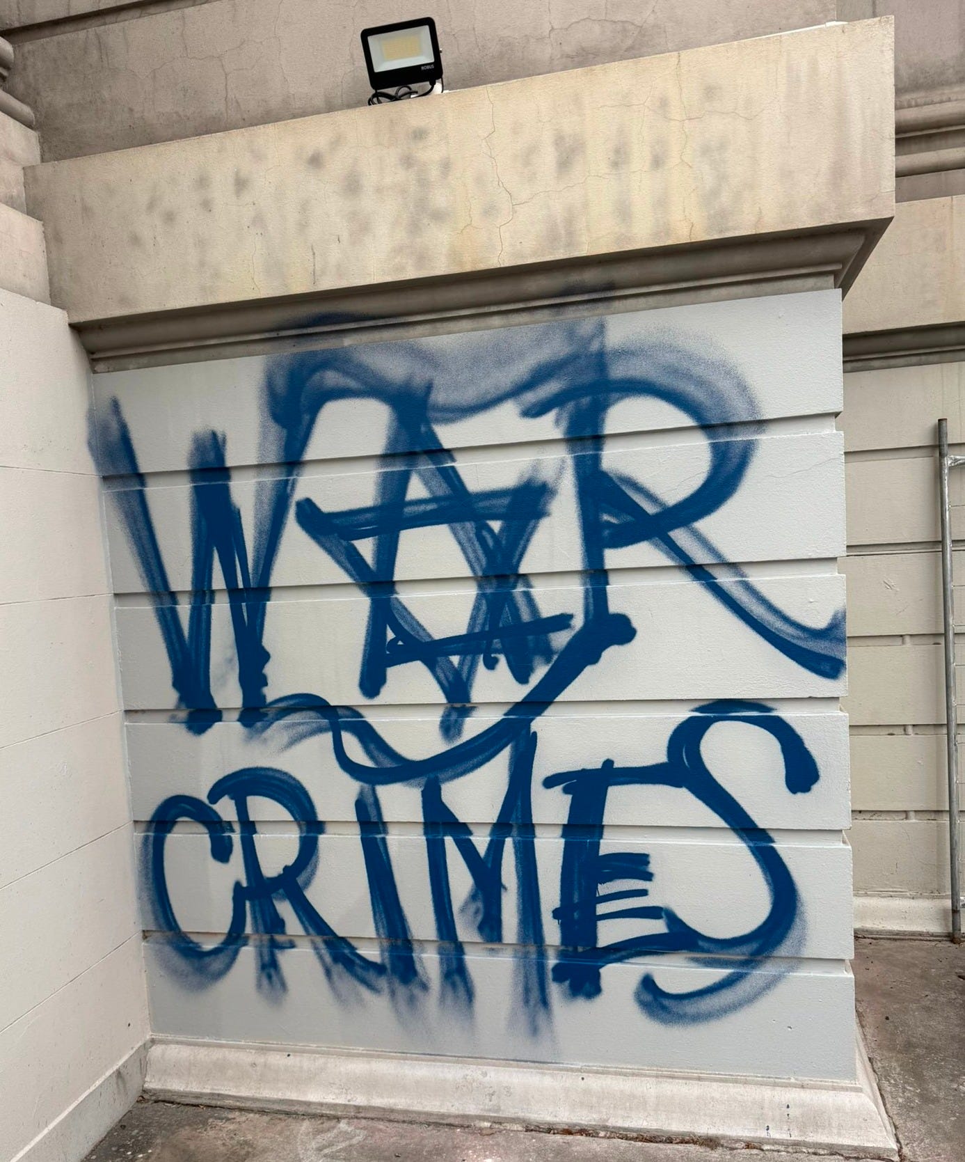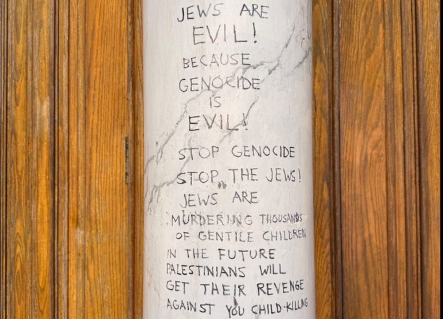 The graffiti contained inflammatory language targeting Jewish people and making references to the ongoing Israel-Hamas War, reading: "Jews are evil! Because genocide is evil! Stop genocide stop the Jews! Jews are murdering thousands of gentile children in the future Palestinians will get their revenge against you child-killing Jew-monsters!"