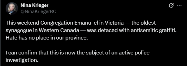 In Victoria, BC, hateful graffiti discovered at the progressive Conservative synagogue prompted swift condemnation from the Jewish Federation of Greater Vancouver, which described the vandalism as an assault on Jewish institutions that threatens the security and dignity of the entire community.