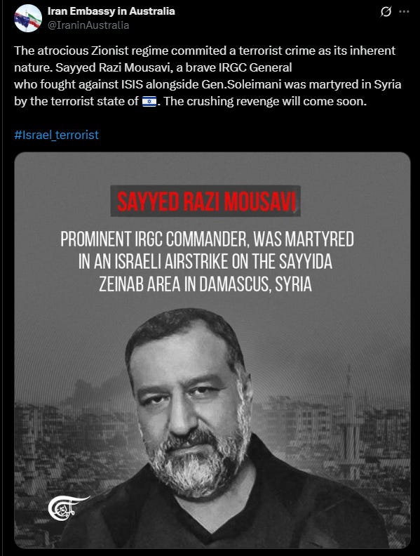 The embassy's posts escalated to include threatening language following Israeli military operations. In December 2023, after Israel eliminated former IRGC general Sayyed Razi Mousavi in Damascus, the Iranian Embassy in Australia published a commemorative post declaring: "The crushing revenge will come soon."