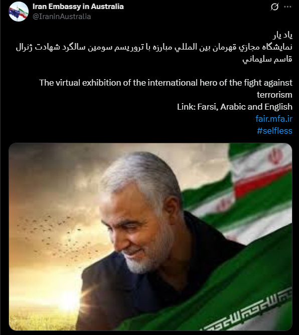 Similarly, in January 2023, the Iranian Embassy promoted a virtual exhibition glorifying Soleimani as an "international hero," further demonstrating their support for designated terrorist operatives.