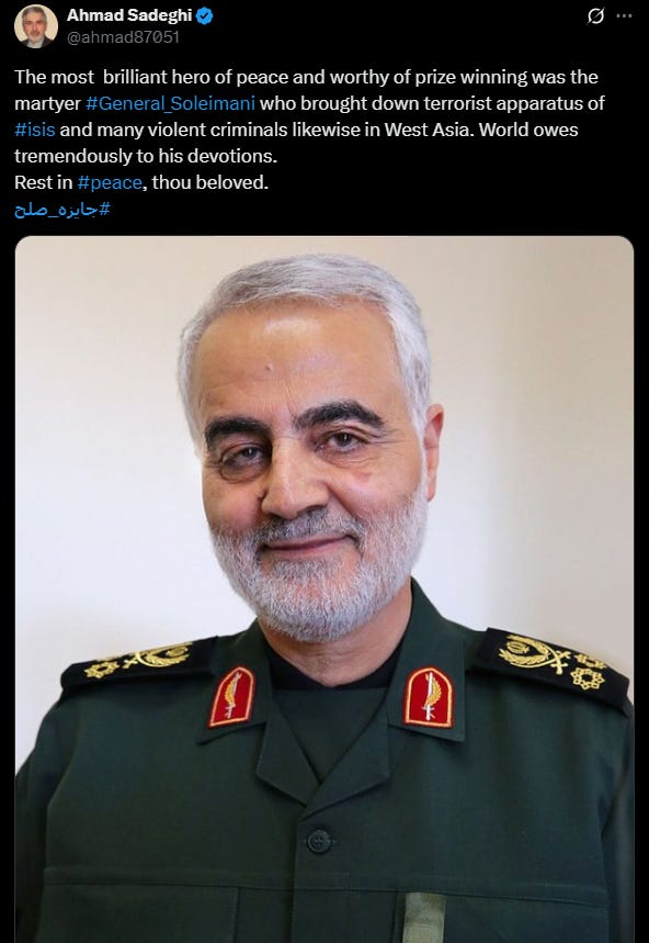 On the day of Hamas's October 7 massacre against Israel, Sadeghi posted a tribute honoring Qassem Soleimani, the former IRGC-Quds Force general eliminated by a U.S. drone strike in January 2020 during President Trump's first term. Soleimani was directly responsible for targeting, injuring, and killing hundreds of American civilians and military personnel through proxy operations across the Middle East.